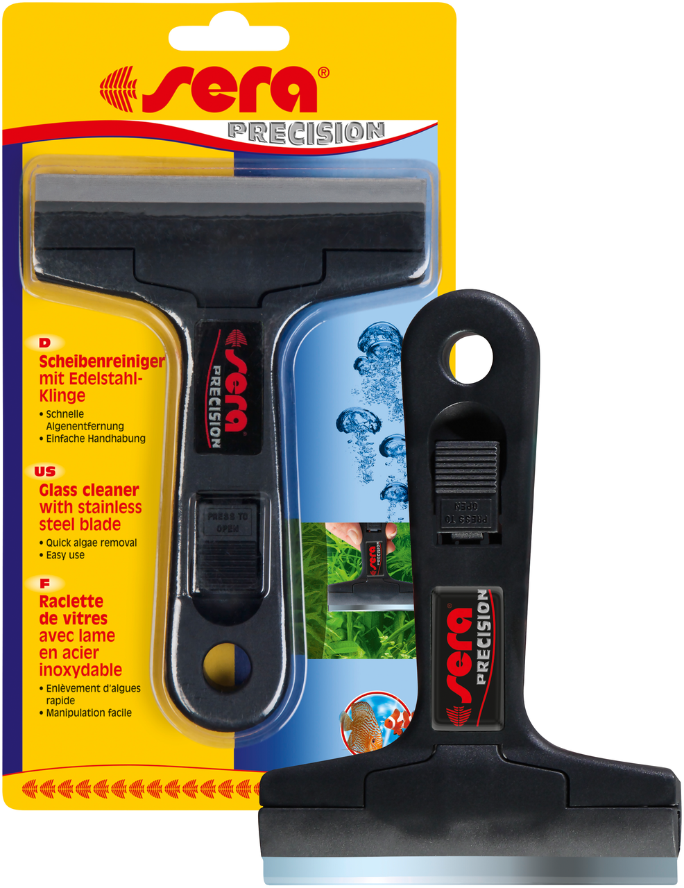 Pomocou tejto nerezovej čepele sú zo skla odstránené aj veľmi húževnaté riasy. Výmena noža je veľmi jednoduchá, vykonáva sa stlačením tlačidla vo vnútri rukoväte. Čepeľ je v rukoväti pevne usadená. Pomôcka je vhodná pre údržbu sladkovodných a morských akvárií a pri chove vodných krytnačiek v akvateráriách. K dostaniu aj náhradné čepele pre Sera škrabku skla
