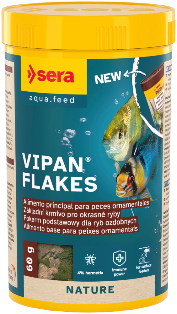 Sera Vipan Flakes a Sera Vipan Flakes XL sú kvalitné základné krmivá pre všetky okrasné ryby, ktoré sa živia pri hladine. Plávajúce vločky sú vhodné na každodenné kŕmenie a poskytujú rybám všetky dôležité živiny v optimálnom množstve.